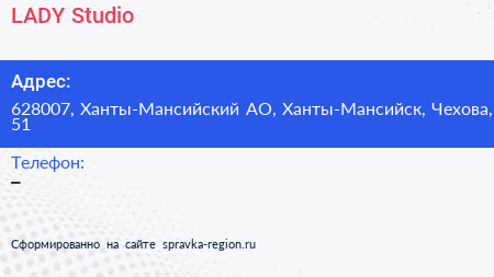 LADY`Studio по адресу 628007, Ханты-Мансийский АО, Ханты-Мансийск, Чехова, 51 в дальнейшем Организация, размещена в следующих категориях: