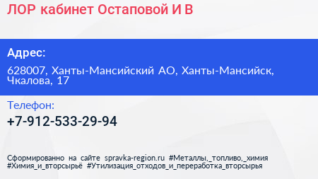 ЛОР-кабинет Остаповой И.В. по адресу 628007, Ханты-Мансийский АО, Ханты-Мансийск, Чкалова, 17 в дальнейшем Организация, размещена в следующих категориях: