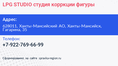 LPG STUDIO, студия корркции фигуры по адресу 628011, Ханты-Мансийский АО, Ханты-Мансийск, Гагарина, 35 в дальнейшем Организация, размещена в следующих категориях: