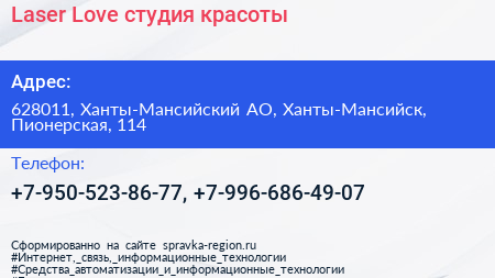 Laser Love, студия красоты по адресу 628011, Ханты-Мансийский АО, Ханты-Мансийск, Пионерская, 114 в дальнейшем Организация, размещена в следующих категориях: