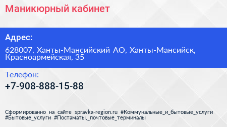 Маникюрный кабинет по адресу 628007, Ханты-Мансийский АО, Ханты-Мансийск, Красноармейская, 35 в дальнейшем Организация, размещена в следующих категориях: