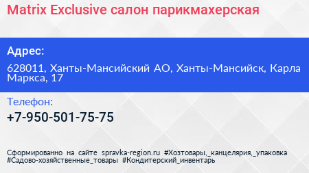 Matrix Exclusive, салон-парикмахерская по адресу 628011, Ханты-Мансийский АО, Ханты-Мансийск, Карла Маркса, 17 в дальнейшем Организация, размещена в следующих категориях: