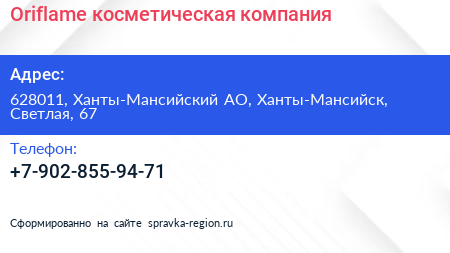 Oriflame, косметическая компания по адресу 628011, Ханты-Мансийский АО, Ханты-Мансийск, Светлая, 67 в дальнейшем Организация, размещена в следующих категориях:
