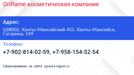 Oriflame, косметическая компания по адресу 628002, Ханты-Мансийский АО, Ханты-Мансийск, Гагарина, 149 в дальнейшем Организация, размещена в следующих категориях: