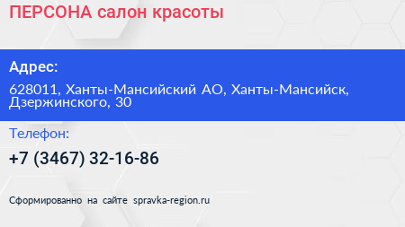ПЕРСОНА, салон красоты по адресу 628011, Ханты-Мансийский АО, Ханты-Мансийск, Дзержинского, 30 в дальнейшем Организация, размещена в следующих категориях: