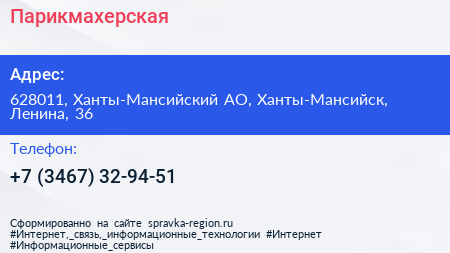 Парикмахерская по адресу 628011, Ханты-Мансийский АО, Ханты-Мансийск, Ленина, 36 в дальнейшем Организация, размещена в следующих категориях: