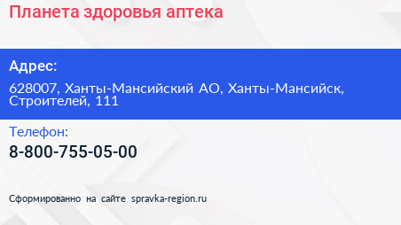 Планета здоровья, аптека по адресу 628007, Ханты-Мансийский АО, Ханты-Мансийск, Строителей, 111 в дальнейшем Организация, размещена в следующих категориях: