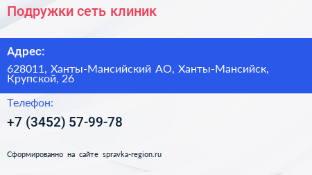 Подружки, сеть клиник по адресу 628011, Ханты-Мансийский АО, Ханты-Мансийск, Крупской, 26 в дальнейшем Организация, размещена в следующих категориях: