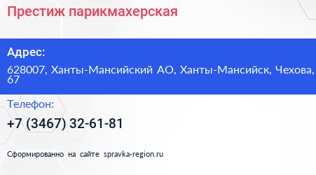 Престиж, парикмахерская по адресу 628007, Ханты-Мансийский АО, Ханты-Мансийск, Чехова, 67 в дальнейшем Организация, размещена в следующих категориях:
