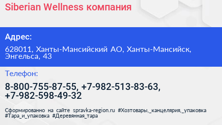 Siberian Wellness, компания по адресу 628011, Ханты-Мансийский АО, Ханты-Мансийск, Энгельса, 43 в дальнейшем Организация, размещена в следующих категориях: