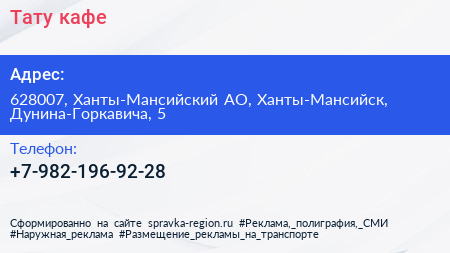 Тату-кафе по адресу 628007, Ханты-Мансийский АО, Ханты-Мансийск, Дунина-Горкавича, 5 в дальнейшем Организация, размещена в следующих категориях: