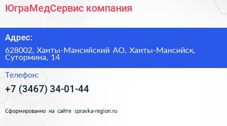 ЮграМедСервис, компания по адресу 628002, Ханты-Мансийский АО, Ханты-Мансийск, Сутормина, 14 в дальнейшем Организация, размещена в следующих категориях: