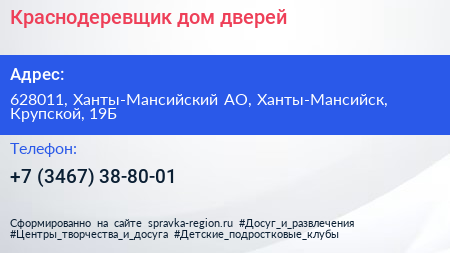 Краснодеревщик, дом дверей по адресу 628011, Ханты-Мансийский АО, Ханты-Мансийск, Крупской, 19Б в дальнейшем Организация, размещена в следующих категориях: