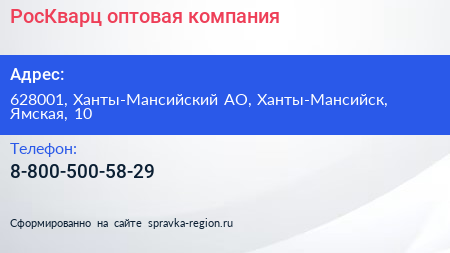 РосКварц, оптовая компания по адресу 628001, Ханты-Мансийский АО, Ханты-Мансийск, Ямская, 10 в дальнейшем Организация, размещена в следующих категориях: