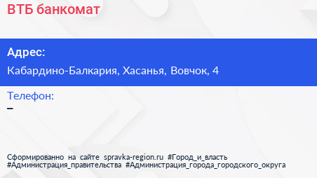 ВТБ, банкомат по адресу Кабардино-Балкария, Хасанья, Вовчок, 4 в дальнейшем Организация, размещена в следующих категориях: