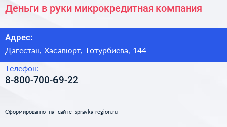 Деньги в руки, микрокредитная компания по адресу Дагестан, Хасавюрт, Тотурбиева, 144 в дальнейшем Организация, размещена в следующих категориях: