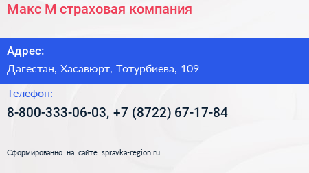 Макс-М, страховая компания по адресу Дагестан, Хасавюрт, Тотурбиева, 109 в дальнейшем Организация, размещена в следующих категориях: