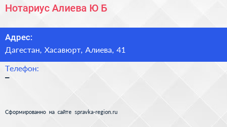 Нотариус Алиева Ю.Б. по адресу Дагестан, Хасавюрт, Алиева, 41 в дальнейшем Организация, размещена в следующих категориях: