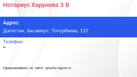 Нотариус Харунова З.В. по адресу Дагестан, Хасавюрт, Тотурбиева, 127 в дальнейшем Организация, размещена в следующих категориях: