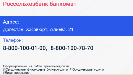 Россельхозбанк, банкомат по адресу Дагестан, Хасавюрт, Алиева, 21 в дальнейшем Организация, размещена в следующих категориях: