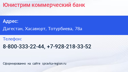 Юнистрим, коммерческий банк по адресу Дагестан, Хасавюрт, Тотурбиева, 78а в дальнейшем Организация, размещена в следующих категориях: