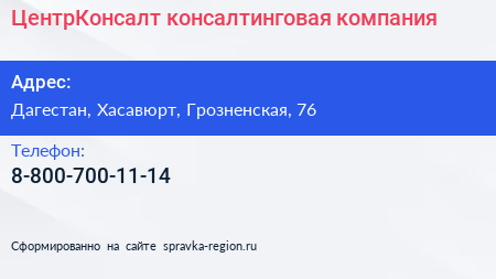 ЦентрКонсалт, консалтинговая компания по адресу Дагестан, Хасавюрт, Грозненская, 76 в дальнейшем Организация, размещена в следующих категориях: