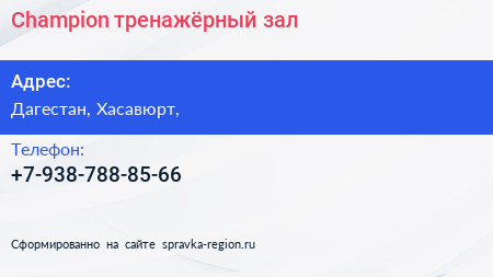Champion, тренажёрный зал по адресу Дагестан, Хасавюрт, в дальнейшем Организация, размещена в следующих категориях: