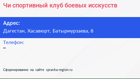 Чи, спортивный клуб боевых исскусств по адресу Дагестан, Хасавюрт, Батырмурзаева, 8 в дальнейшем Организация, размещена в следующих категориях: