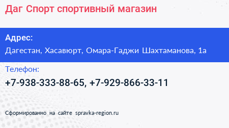 Даг-Спорт, спортивный магазин по адресу Дагестан, Хасавюрт, Омара-Гаджи Шахтаманова, 1а в дальнейшем Организация, размещена в следующих категориях: