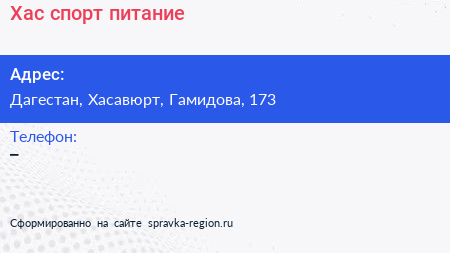 Хас спорт питание по адресу Дагестан, Хасавюрт, Гамидова, 173 в дальнейшем Организация, размещена в следующих категориях: