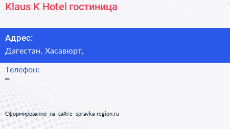 Klaus K Hotel, гостиница по адресу Дагестан, Хасавюрт, в дальнейшем Организация, размещена в следующих категориях:
