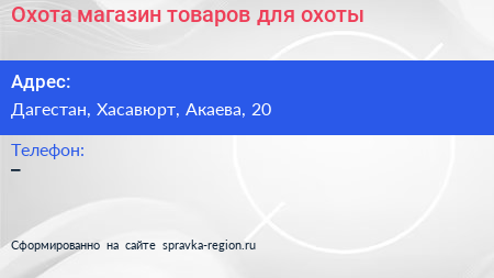 Охота, магазин товаров для охоты по адресу Дагестан, Хасавюрт, Акаева, 20 в дальнейшем Организация, размещена в следующих категориях: