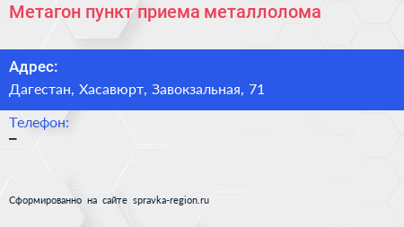 Метагон, пункт приема металлолома по адресу Дагестан, Хасавюрт, Завокзальная, 71 в дальнейшем Организация, размещена в следующих категориях: