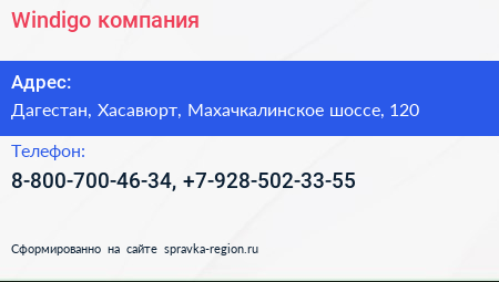 Windigo, компания по адресу Дагестан, Хасавюрт, Махачкалинское шоссе, 120 в дальнейшем Организация, размещена в следующих категориях: