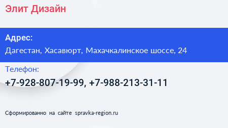 Элит-Дизайн по адресу Дагестан, Хасавюрт, Махачкалинское шоссе, 24 в дальнейшем Организация, размещена в следующих категориях: