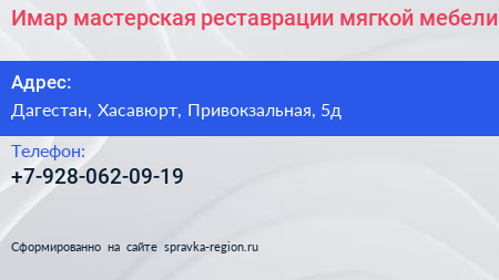 Имар, мастерская реставрации мягкой мебели по адресу Дагестан, Хасавюрт, Привокзальная, 5д в дальнейшем Организация, размещена в следующих категориях: