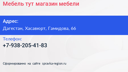 Мебель тут, магазин мебели по адресу Дагестан, Хасавюрт, Гамидова, 66 в дальнейшем Организация, размещена в следующих категориях: