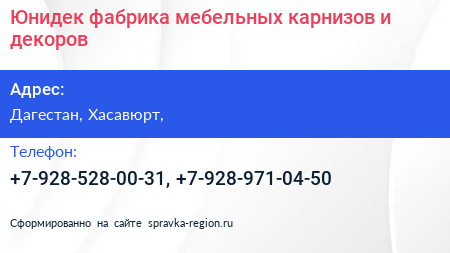 Юнидек, фабрика мебельных карнизов и декоров по адресу Дагестан, Хасавюрт, в дальнейшем Организация, размещена в следующих категориях: