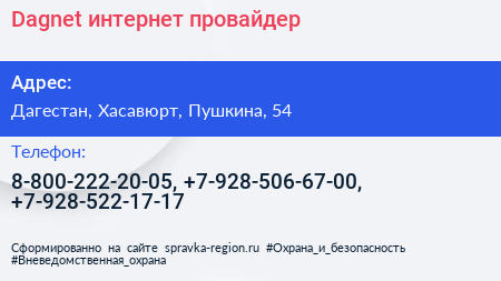 Dagnet, интернет-провайдер по адресу Дагестан, Хасавюрт, Пушкина, 54 в дальнейшем Организация, размещена в следующих категориях: