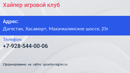 Хайпер, игровой клуб по адресу Дагестан, Хасавюрт, Махачкалинское шоссе, 25г в дальнейшем Организация, размещена в следующих категориях: