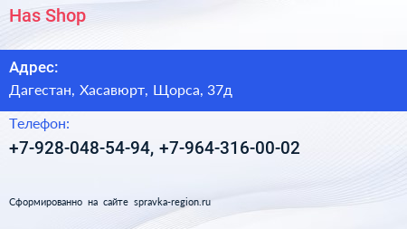 Has Shop по адресу Дагестан, Хасавюрт, Щорса, 37д в дальнейшем Организация, размещена в следующих категориях: