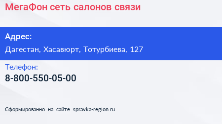 МегаФон, сеть салонов связи по адресу Дагестан, Хасавюрт, Тотурбиева, 127 в дальнейшем Организация, размещена в следующих категориях: