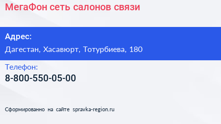 МегаФон, сеть салонов связи по адресу Дагестан, Хасавюрт, Тотурбиева, 180 в дальнейшем Организация, размещена в следующих категориях:
