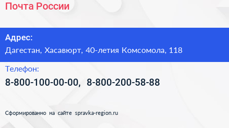 Почта России по адресу Дагестан, Хасавюрт, 40-летия Комсомола, 118 в дальнейшем Организация, размещена в следующих категориях: