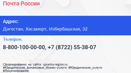 Почта России по адресу Дагестан, Хасавюрт, Избербашская, 32 в дальнейшем Организация, размещена в следующих категориях: