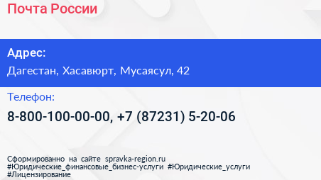 Почта России по адресу Дагестан, Хасавюрт, Мусаясул, 42 в дальнейшем Организация, размещена в следующих категориях:
