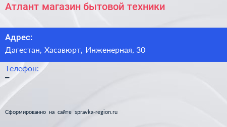 Атлант, магазин бытовой техники по адресу Дагестан, Хасавюрт, Инженерная, 30 в дальнейшем Организация, размещена в следующих категориях: