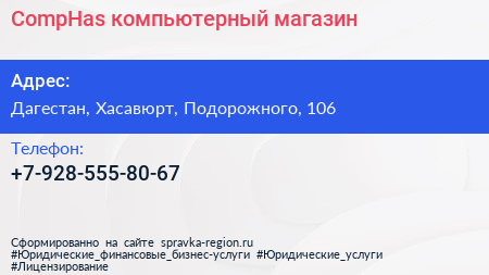 CompHas, компьютерный магазин по адресу Дагестан, Хасавюрт, Подорожного, 106 в дальнейшем Организация, размещена в следующих категориях: