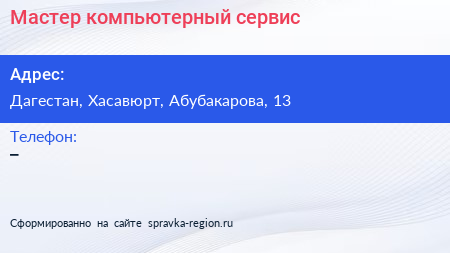 Мастер, компьютерный сервис по адресу Дагестан, Хасавюрт, Абубакарова, 13 в дальнейшем Организация, размещена в следующих категориях: