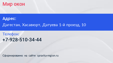 Мир окон по адресу Дагестан, Хасавюрт, Датуева 1-й проезд, 10 в дальнейшем Организация, размещена в следующих категориях: